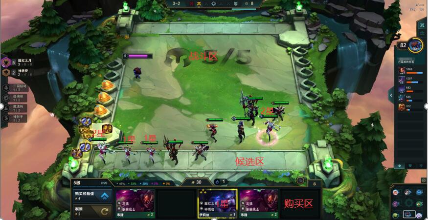 如图所示台上面有战斗区、候选区和购买区,每种英雄分为3个星级,从1~3星级依次递增。其中购买区的英雄均为1星,战斗区和候选区的英雄星级可能有1~3三种星级。