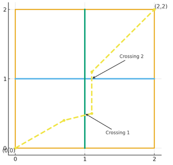 你可以想任意方向移动到达(x,y),但是你的移动必须是位于平面内的连续曲线,每次穿过水平或竖直的激光时都算一次穿越,当穿过两条激光的交点则算作两次穿越。你需要计算从(0,0)到达(x,y)所需要的最少穿越次数。