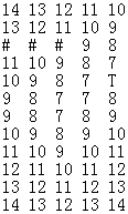 而在迷宫的高处有着p个火把,能够提为周围供14个单位的亮度,这个亮度会按照曼哈顿距离衰减且不会被墙壁遮挡(在高处)。