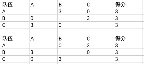 如果说有三只队伍,并且得分都是3,那么有下面两种可能: