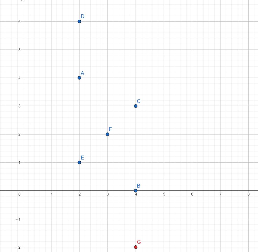 我们可以选取F作为中心点(此点有星星,按照题目定义此点的对称点即为本身,我们可以认为它与自己对称),此时CE对称,AB对称,我们只需要添加一个G点便可以使得DG对称。
